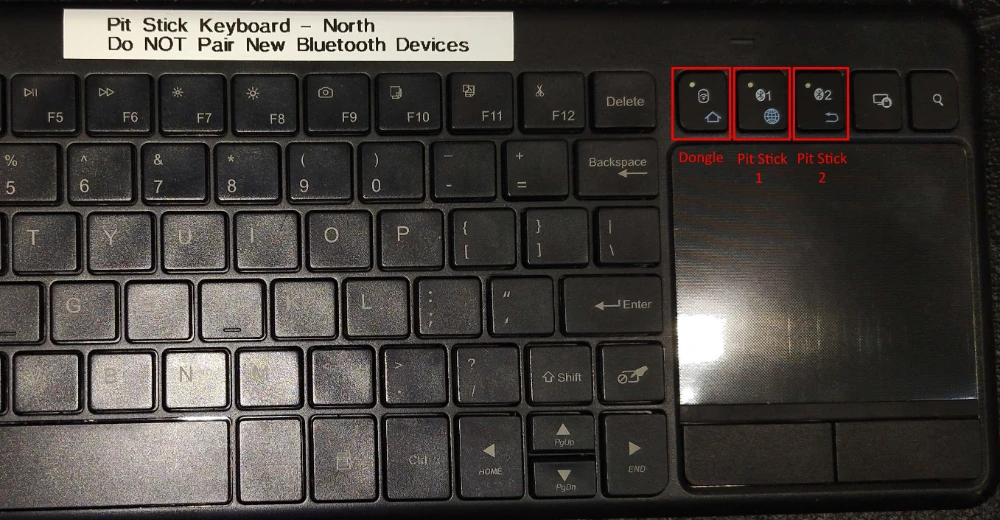 A wireless keyboard/mouse combination is provided in the Production Drawers. It contains two Bluetooth device slots, which have been pre-paired to each of the Pit Sticks. There is also a USB RF dongle, located on the back of the keyboard, inside the battery door. This dongle is useful for use with other devices, or for accessing a keyboard interface if the Bluetooth connection fails. Select the device that the keyboard transmits to by using one of the three buttons above the touchpad. Grab this keyboard to help interface with the pit sticks before continuing.