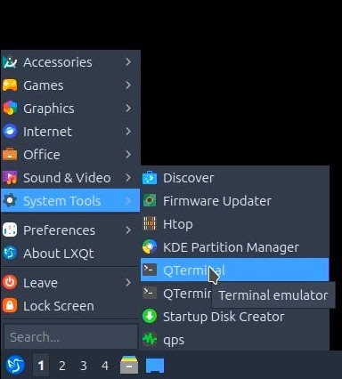 - If the browser window is shown fullscreen, press the Super/Windows key to open the menu over top. Select System Tools > QTerminal to open the terminal. You may need to then hit Alt-Tab to change active windows.