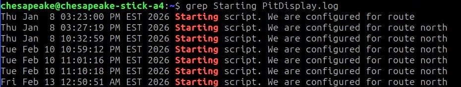 grep Starting PitDisplay.logand press enter. You should see a number of lines that identify a route (north or south).