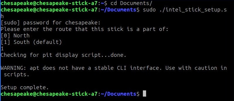 sudo ./intel_stick_setup.shand press enter. The sudo password ismushroom. - In the prompt, type the number corresponding to the route you are on, then press enter. If you do not enter a value, or enter an invalid value, the script defaults to the south route. This script should complete with a message stating “Setup complete”. The warning displayed below is expected and can be ignored.