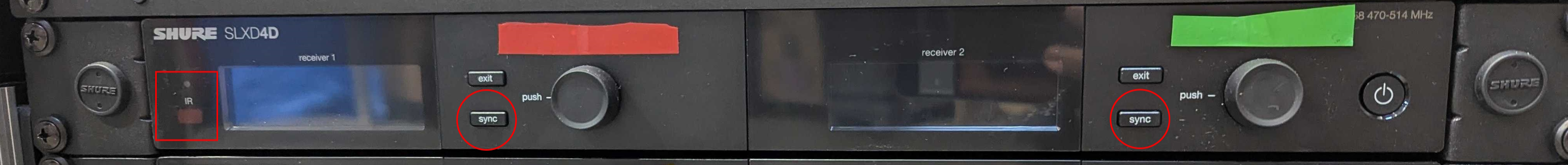 - Press the ‘sync’ button located underneath the receiver’s tape (each receiver’s sync button is outlined in a circle). Note also the IR window visible on the left side, outlined in a square.
