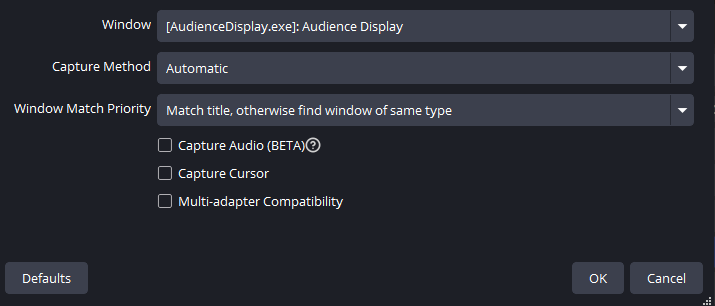 - Double-click on the Window Capture source. This may be named something different, but the icon should be identical to the one shown above. Re-select the “Window” in the menu that opens up with the “AudienceDisplay.exe” option. Click OK.