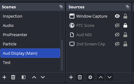 - In OBS, navigate to the “Aud Display” or “Audience Display” scene in the bottom-left corner.