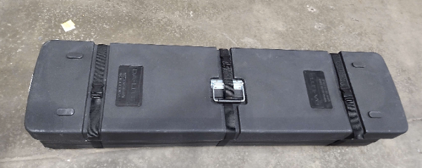This is a short, long, black wheeled case that contains the large projection screen used at events.