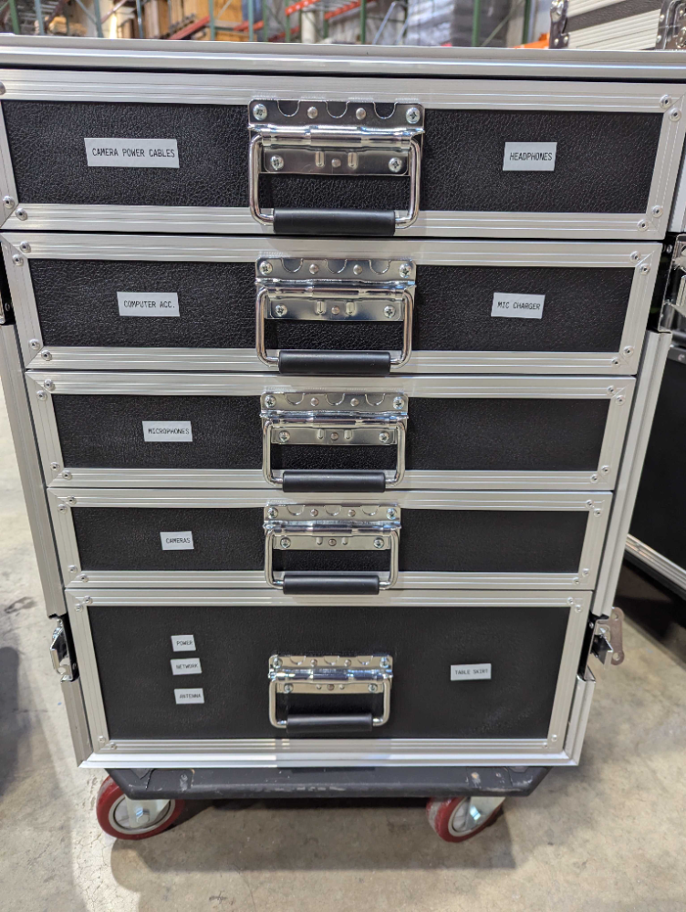 This is a short, wheeled black case that contains storage drawers for key A/V equipment. It contains many key cables and smaller items for AV setup.