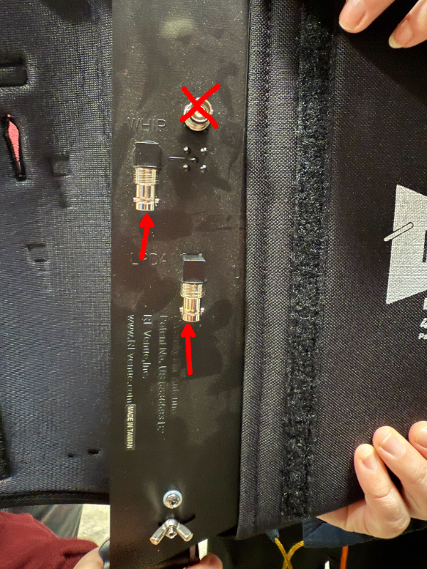 - Connect the other end of the cable to the connectors on the fin antenna labeled “LPDA” and “WHIP”. It does not matter which port is connected to which cable in this setup. Be careful not to connect to the outputs for the whip antennas.