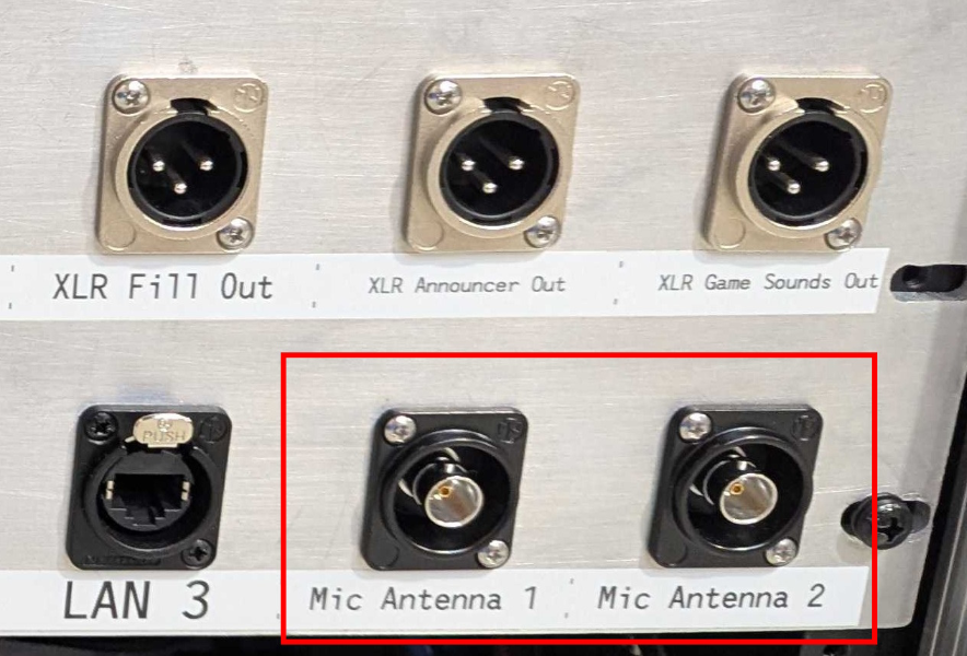 - Connect one end of each SDI cable to the ports labeled “Mic Antenna 1” and “Mic Antenna 2” on the back of the Streaming Unit.