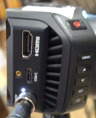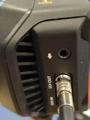 Attach the mini-SDI to SDI cable to the “SDI Out” port of the camera. Attach the standard SDI cable to the end of the mini-SDI to SDI cable.