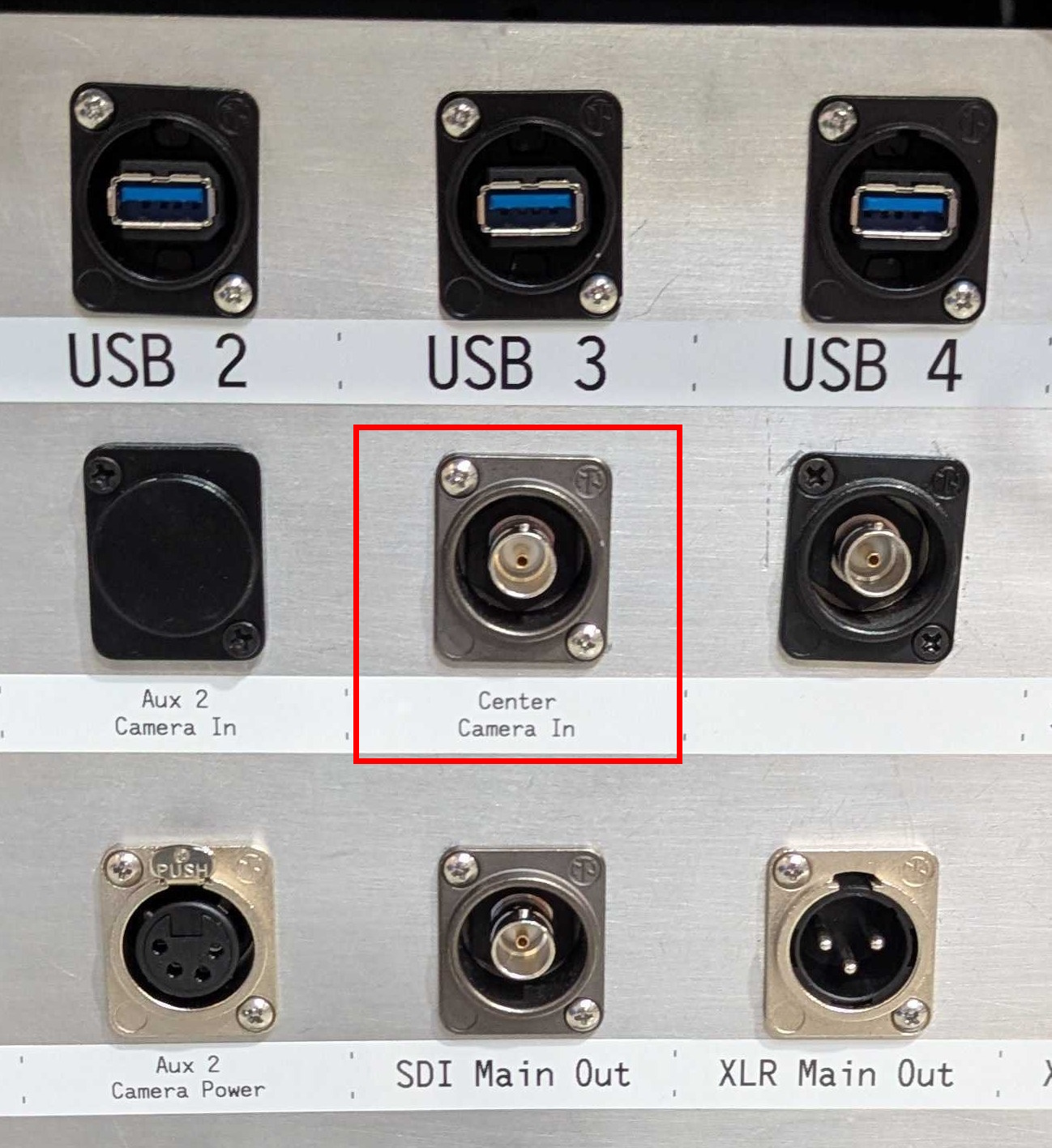 Run the long SDI cable back to the Streaming Unit and attach the SDI connector to the Center Camera In.