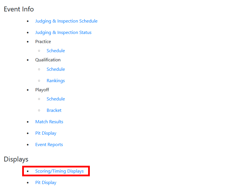 - If you are not prompted to select an event, you will land on the same dashboard as if you were prompted to select an event. Within this dashboard, select “Scoring/Timing Displays” near the bottom of the screen.