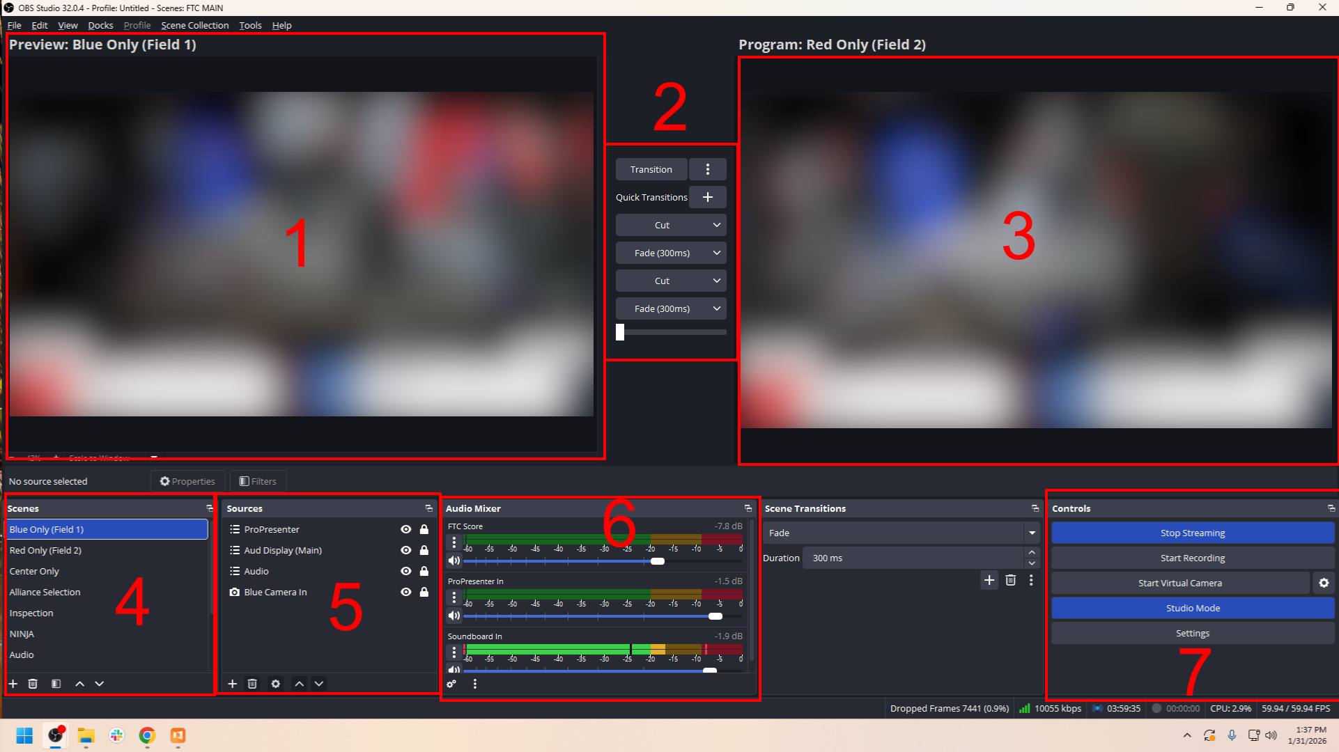 - You can either request scorekeepers to show “video only” in FTC Live, or temporarily hide the Aud Display (Main) source (click the eye icon to hide) within the Center Only scene.
