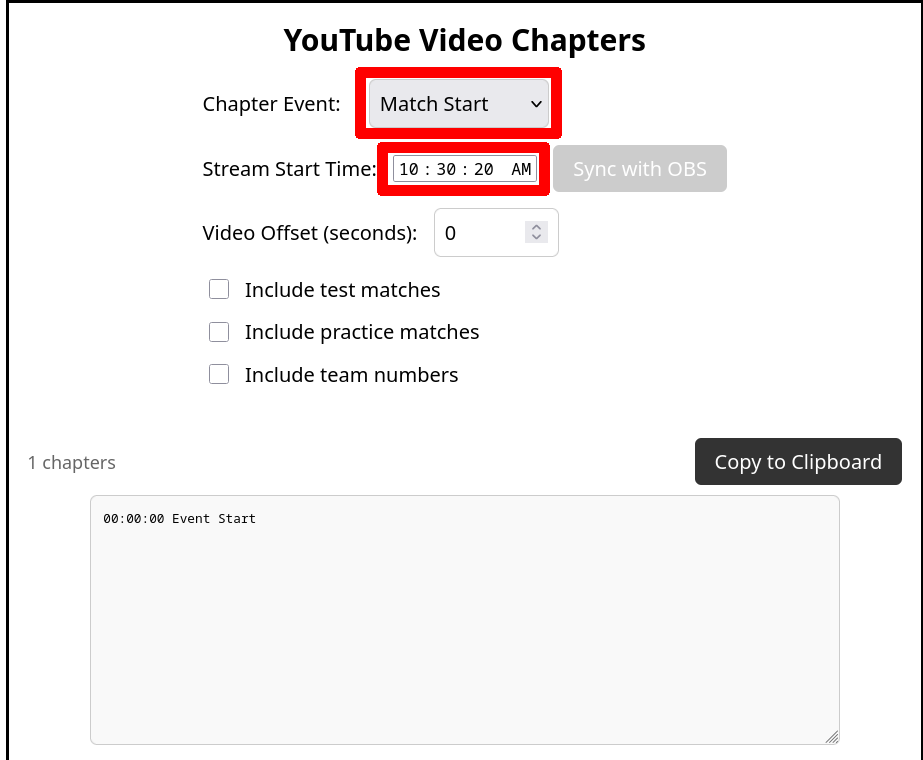 In the YouTube livestream configuration used by FIRST Chesapeake, the time used by the “Sync with OBS” button will be wrong, as it will be the time OBS started streaming - not the time the YouTube stream actually went live. It’s recommended that you manually enter the time you clicked “Go Live”, or an estimation of when this occurred rather than rely on the Sync with OBS button. Use this function only as a last resort, if the start time was completely forgotten.