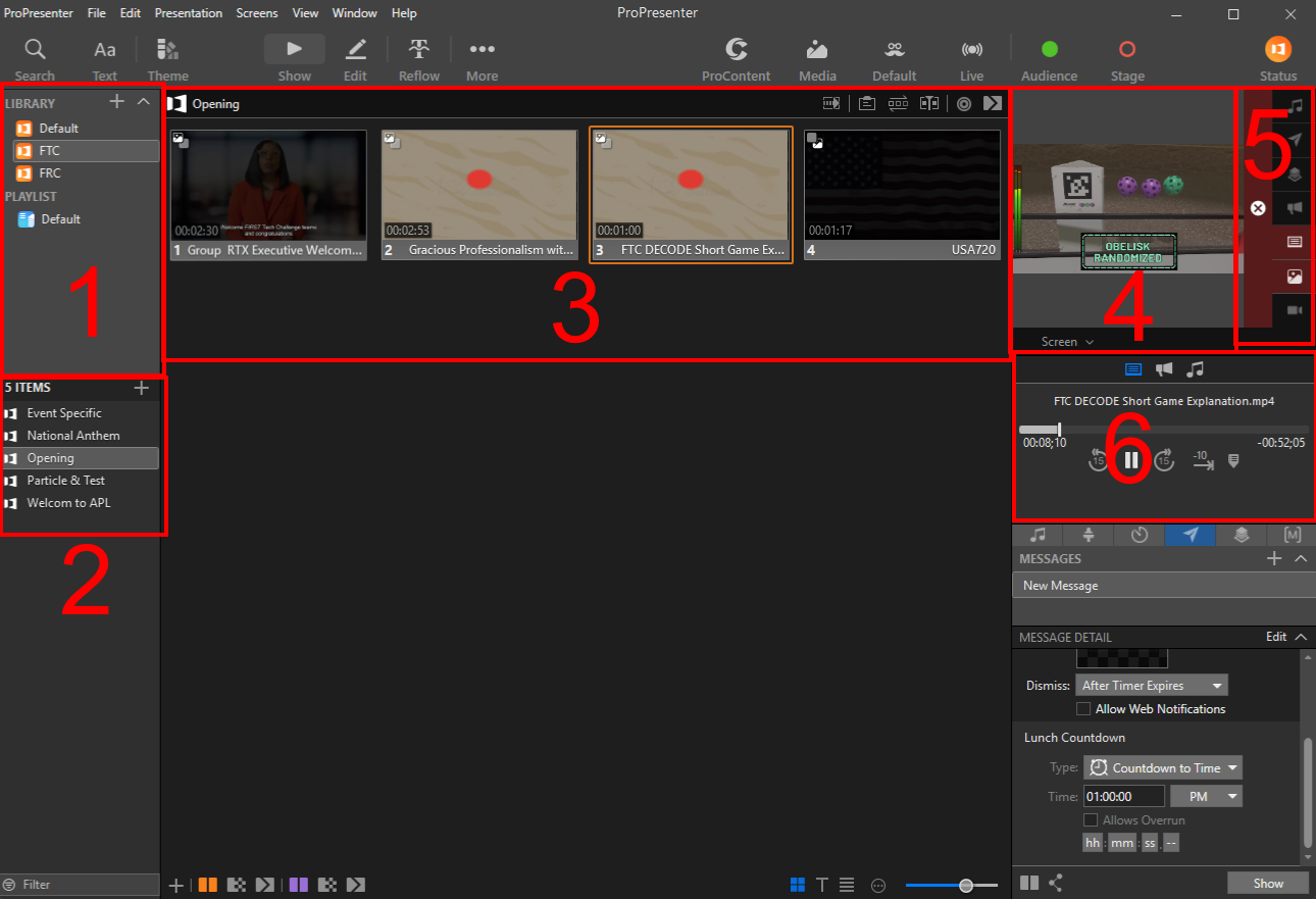 - Videos play during the opening ceremonies - they are called out in the script. Use ProPresenter to play the videos over the Center Only scene - do not play opening ceremony videos through FTC Live.